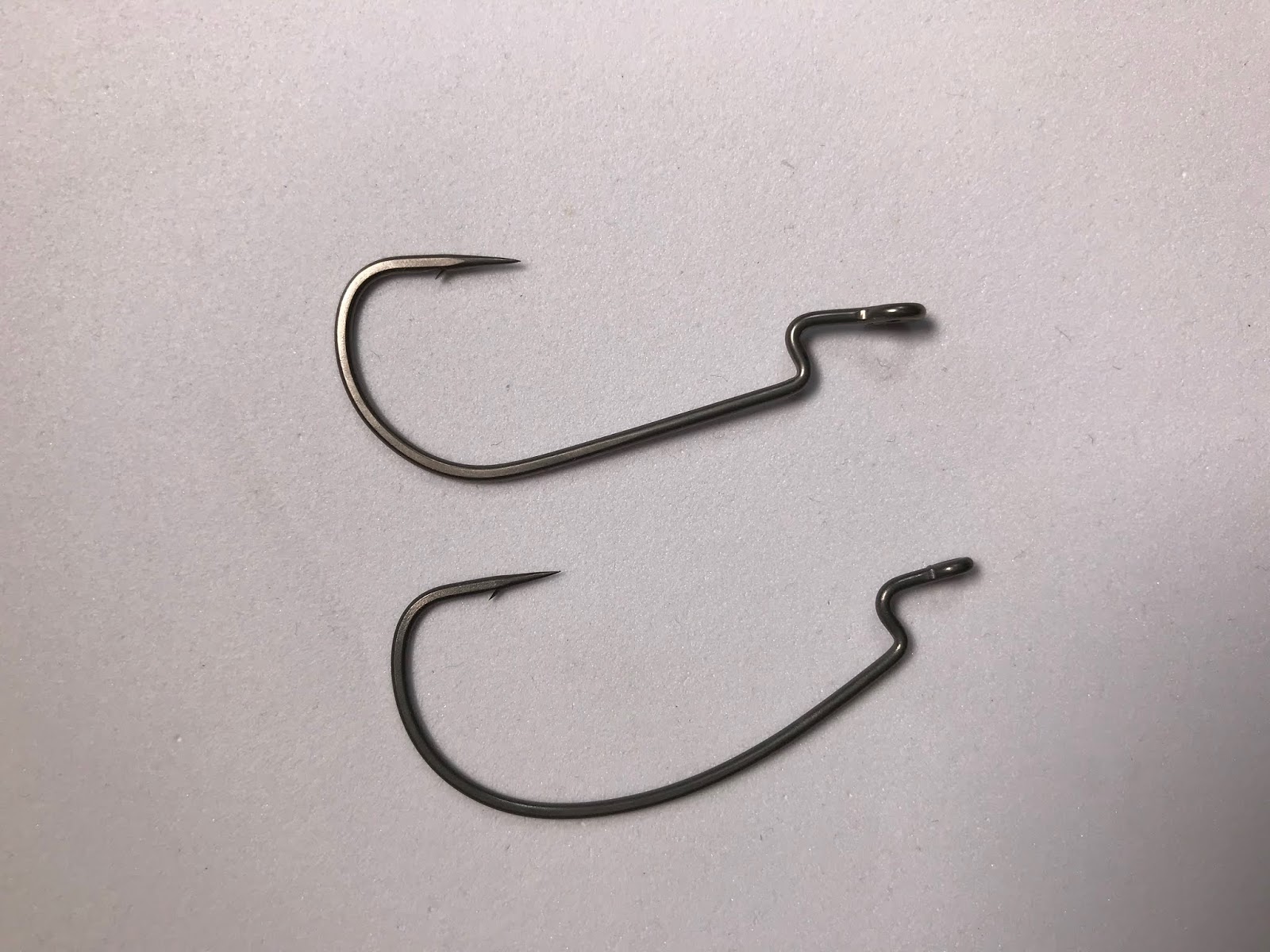 上がエルディーマスターで、下が一般的なオフセットフックです。フックの湾曲している部分がエルディーマスターはストレートに近いですね。フックの幅が狭くなっている。