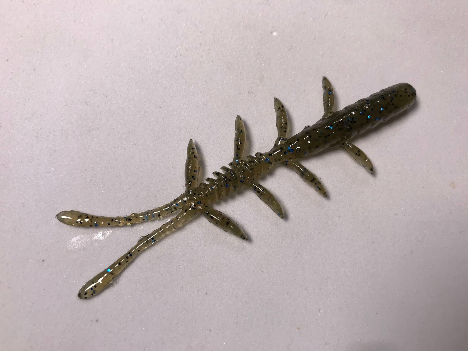 このシザーコームの特徴はなんと言っても4対のアームですね。このアームが水を受けて絶妙なバイブレーションを生む。このアクションは他のワームにはない、自分が知る限りでは。ちょうどエビの内側についている足がピロピロ動いているときのアクションに似ている。