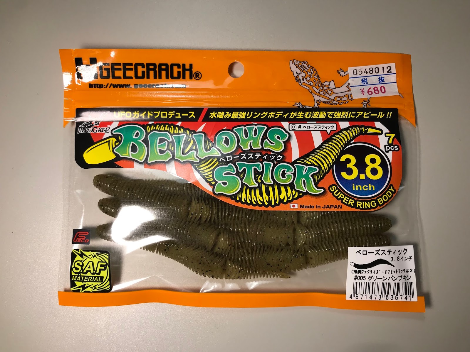 今日は買い物ネタです。ジークラックのベローズスティック3.8inchを買いました。以前ベローズギルというルアーを紹介しましたが、こちらは同じ深いリブ構造が特徴的なワームのスティック版です。